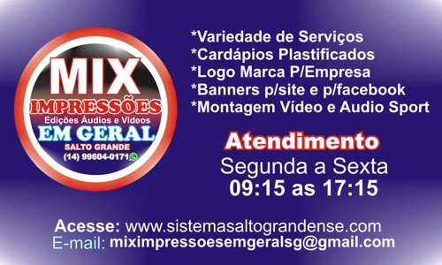 A MIX IMPRESSÕES EM GERAL-SG Fundada 10 de janeiro 2010 Realização e Organização GRUPO SISTEMA SALTOGRANDENSE DE COMUNICAÇÃO/RÁDIO WEB Sistema Saltograndense HD Emissora via internet! Acesse: https://sistemasaltograndense.com