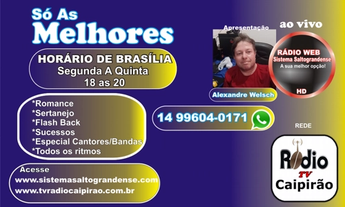 O GRUPO SISTEMA SALTOGRANDENSE DE COMUNICAÇÃO/RÁDIO WEB SISTEMA SALTOGRANDENSE junto com Profissional Apresentador Alexandre Welsch Parceria Só As Melhores RWSS de segunda a quinta as 18 as 20 horas em rede Emissora de Santa Cruz so Rio Pardo WEB RÁDIO CAIPIRÃO, Participação do ouvintes...